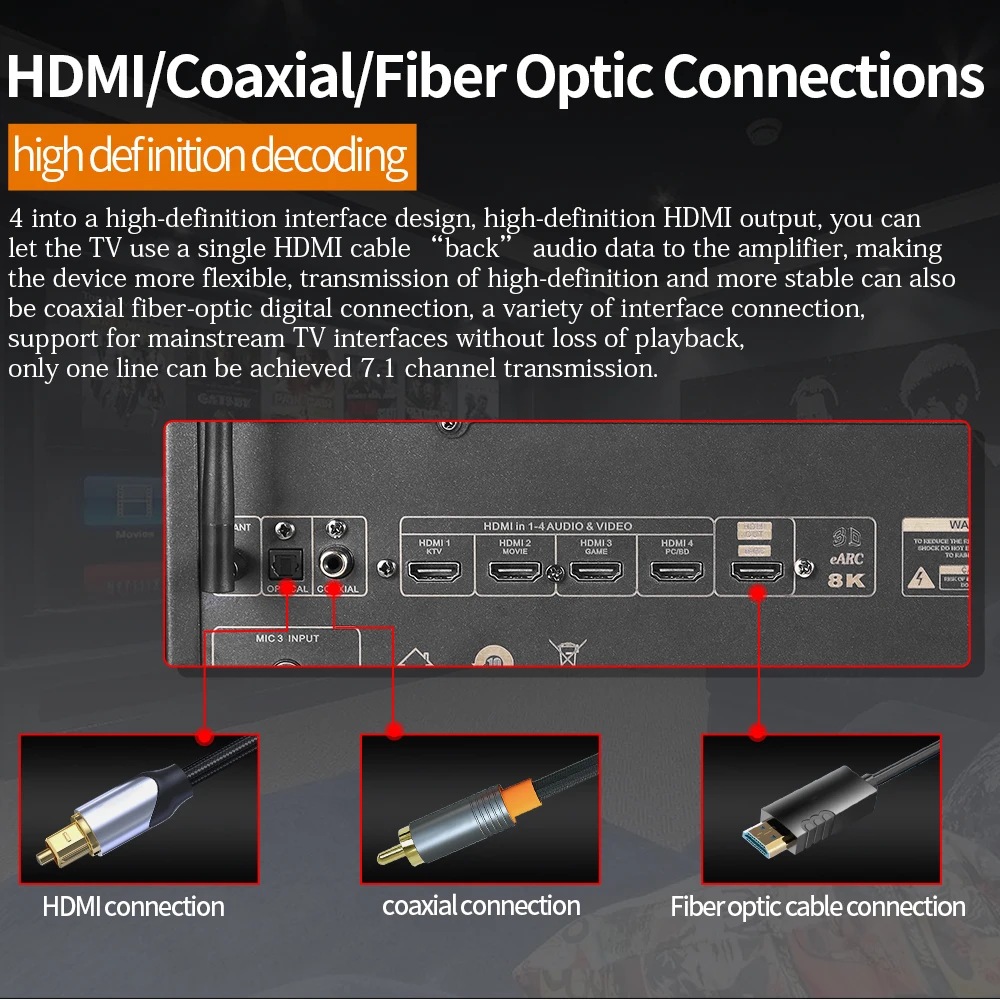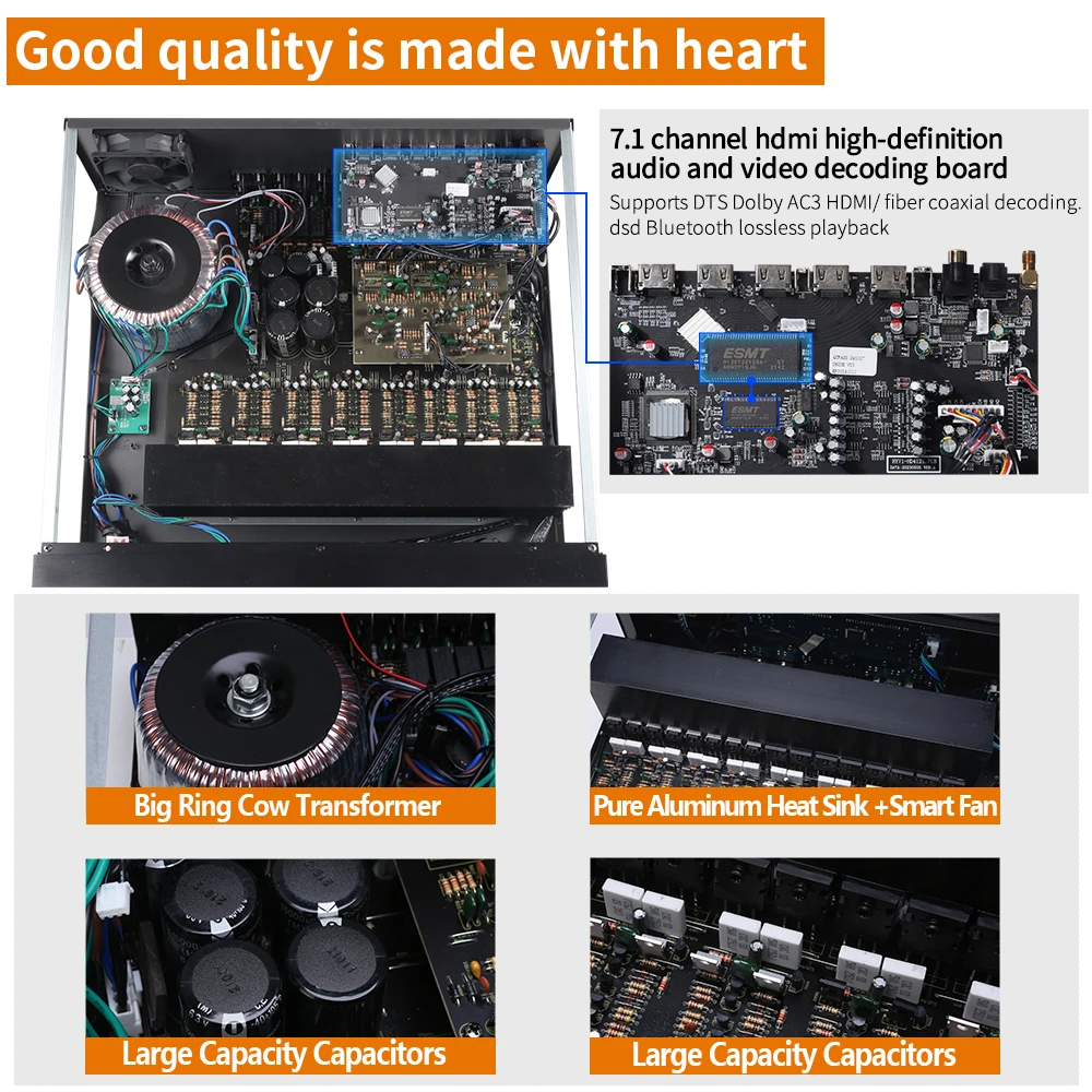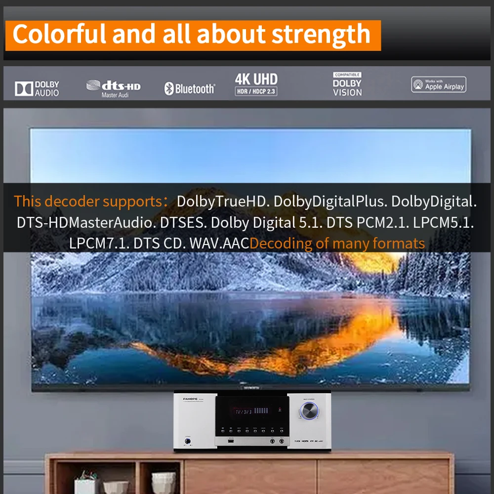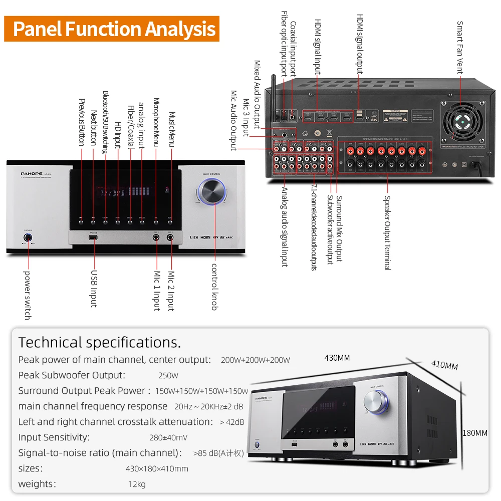 Upgrade your entertainment setup with this 7.1 channel high-power home theater amplifier. Supporting 3D and 4K video passthrough, DTS HD, and advanced digital sound processing, it delivers rich, immersive audio with stunning clarity. With built-in Bluetooth, you can stream music wirelessly from your favorite devices, while multiple input options ensure seamless connectivity for all your media sources. Perfect for movies, gaming, or music, this powerful AV receiver brings theater-quality performance and precision sound into your home.